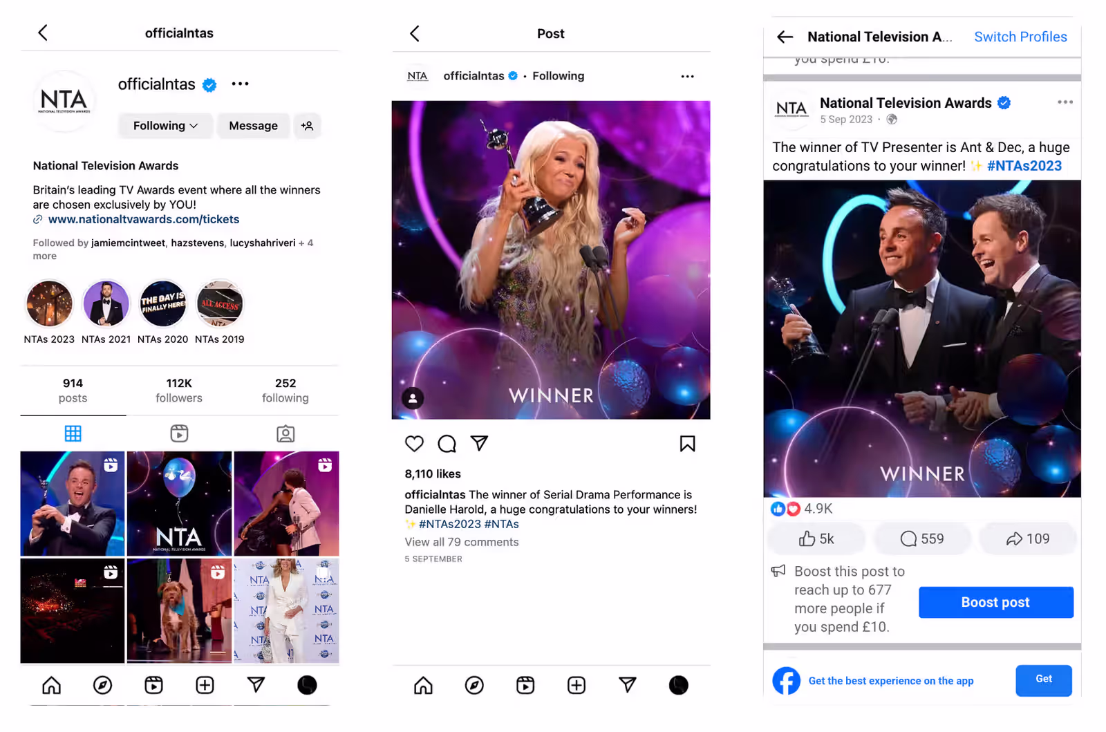 We worked closely with the NTAs production team to align on strategy, event timing, and social media assets. We designed sleek, on-brand frames for the ‘Winner’ and ‘Nominee’ posts on Instagram, while a dedicated onsite team at the O2 sourced images, applied NTA branding, and scheduled content across platforms for live updates. The stellar results of our initiatives speak for themselves.